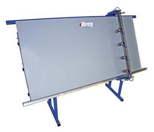 Face Frame Table, 4 x 8 New Kreg Tool Model #KFT4X8 Heavy Duty Face Frame Assembly Table, 4′ x 8′ Melamine Table, 1-1/8″ Melamine Table Thickness, 350 lbs., 4 Clamping Cylinders with Retracting Fence for Frames longer than 8′.