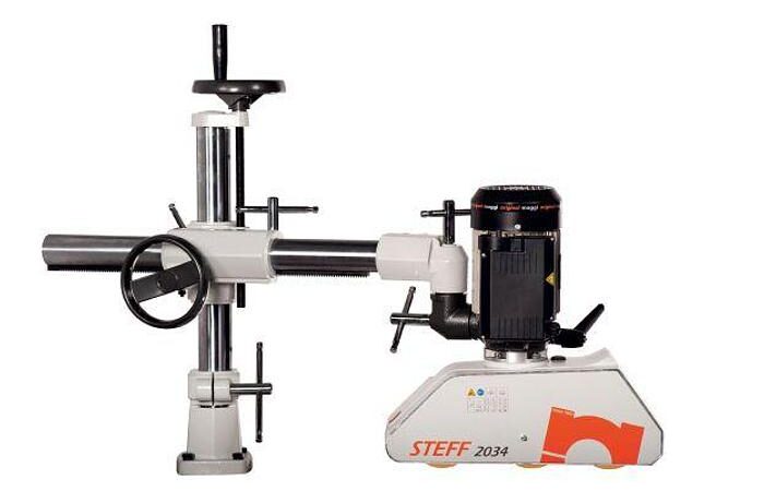Powerfeeder, 3-Roller New Maggi/Steff Model #2034-3 3-Roller, 4-Speed Powerfeeder with Universal Stand, 230 volt, 3-phase machine. Add $100.00 for Single Phase Option. Roller/Belt Vertical Range of Motion 1 inch. Electrostatic paint finish. Sintered case hardened gears. Bronze alloy main drive gear. Natural rubber, 60 shore hardness rollers/belts. (Polyurethane belts/rollers and steel rollers also available). Calibrated spring support for roller adherence.