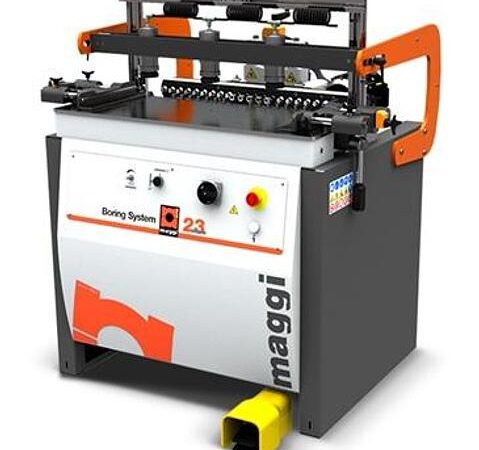 $199 Flat Rate Shipping in the Continental United States The Maggi System 23 Boring Machine provides a 23 spindle 32 mm universal drilling solution, with horizontal and vertical boring capabilities and pneumatic tilting of the boring unit with locking points from 0 to 90 degrees for quick set-up at any angle. Accurate positioning of the boring unit to the table with ย digital readout . 0 to 2.5″ adjustable drilling depth with patented spiral setting device. (2) patented quick release material clamps with auto-setting to firmly hold material to table. Powerful 2 HP motor. 37″ x 13″ cast iron table. Side fences with mechanical digital readout for quick and accurate setting. 120″ line boring fence with (4) stops. Foot actuated pneumatic clamps and drill cycle.ย Includes: Magnetic Starter with overload protection and (23) quick change chucks.ย Dust Outlet: 3″ Voltage: 230V 3-Phase Net weight: 630 lbs. Dimensions: 51.7″ x 37.8″ x 50″ Tall. Crated Dimensions: 42.2″ x 37.4″ x 40.5″ Tall. Crated Weight: 705 lbs.