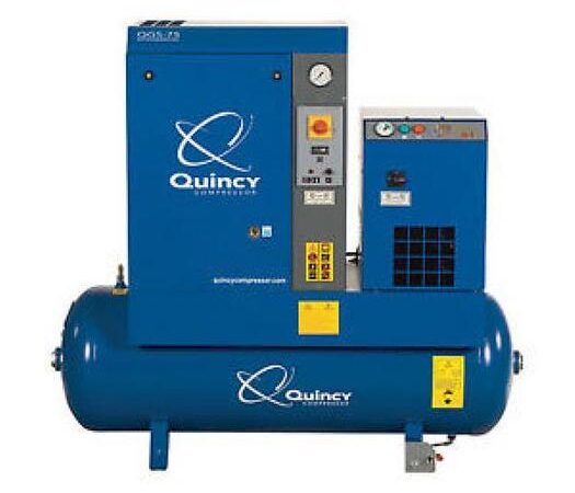 Rotary Screw 10HP Air Compressor New Quincy Compressor Model #QGS-10 Industrial Rotary Screw Air Compressor system with Built in Refrigerated Air Dryer. Rated for 37.0 ACFM @ 125 PSIG. Tank Mounted with 120 Gallon Tank. 10HP, 208/230/460 volt, 3-phase.