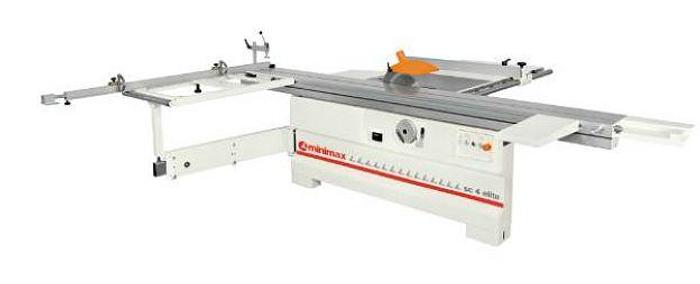 Sliding Table Saw, 8.5′ New SCM/MiniMax Model #SC4 Elite Series Sliding Table Saw machine, 8.5′ Sliding Table saw, 4.8HP Main motor unit with Scoring. 220 volt, 1-phase machine. Standard Equipment Solid cast iron saw unit with double support trunions Aluminum sliding table and rail with hardened steel guide-ways European-style rip fence with cam lock, micro-adjustable Round steel guide bar for rip fence Telescoping crosscut fence with two adjustable flip stops Eccentric panel clamp 2-position sliding table lock Table extension on saw out-feed Scoring blade (Adjusted Independently of Main Blade) 3/4″ dado capacity Tool set & manual “CSA”-rated electrical components, including cables Specifications Sliding Table Size11.4″ x 106″Fixed Table Size33″ x 22″Table Height35″Max Cutting with Rip Fence50″Sliding Table Stroke with Scoring106″Main Blade Arbor Size5/8″Scoring Blade Diameter / Arbor Size100 mm / 20 mmMain Blade Speed4,000 RPMScoring Blade Speed8,000 RPM Electrical & Dust Extraction Requirements 1ph, 4.8hp Standard 3ph, 6.6hp Optional Single-phase: 24 amps, 230v, 10 AWG CU THHN wire Three-phase: 18 amps, 230v, 12 AWG CU THHN wire (Special Order) Dust outlet diameter, main port: 4 3/4″ Dust outlet diameter, overhead blade guard: 2.5″ Dust extraction volume: 1,000 CFM
